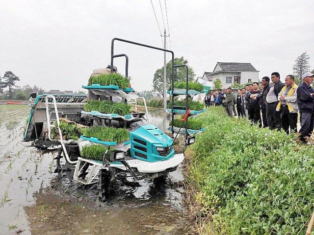 布谷啼播春暮日,栽插种管事繁多。4月21日,沉寂已久的农田里传来隆隆机声音,我县再生稻机械化插秧现场演示会如期在涛城镇红星村召开。有农机局、农机大户、农业经营组织、农机经销商等共计80多人参会。随着插秧机在田里快速敏捷地来回穿梭,留下一排排绿油油的秧苗,田间地头不时传来参会者朗朗的笑声。